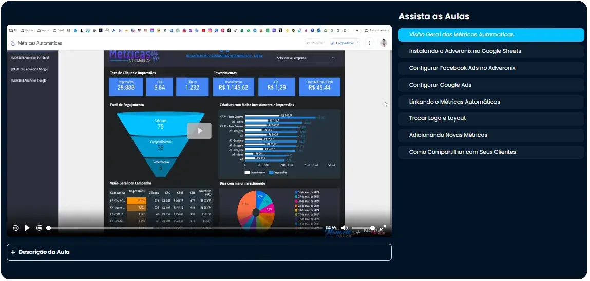 Você vai receber Tutoriais de uso, para aprender a usar o Métricas Automáticas do Jeito correto! Aulas completas do Inicio ao Fim te ensinando a Instalar, configurar com Facebook ADS e Google ADS, como compartilhar com seus clientes.