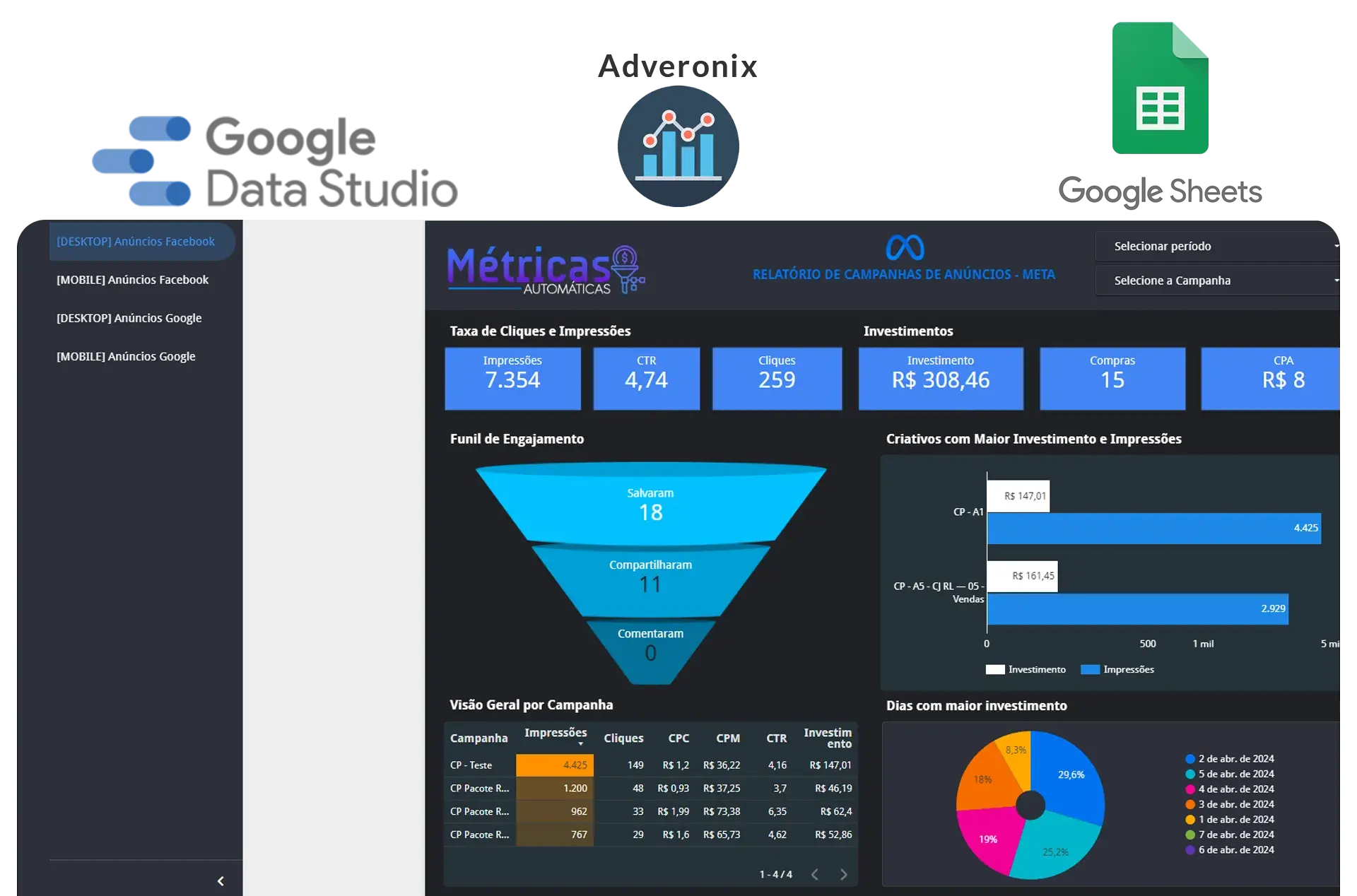 Tudo integrado ao Google Data Studio, Adveronix e Google Sheets.