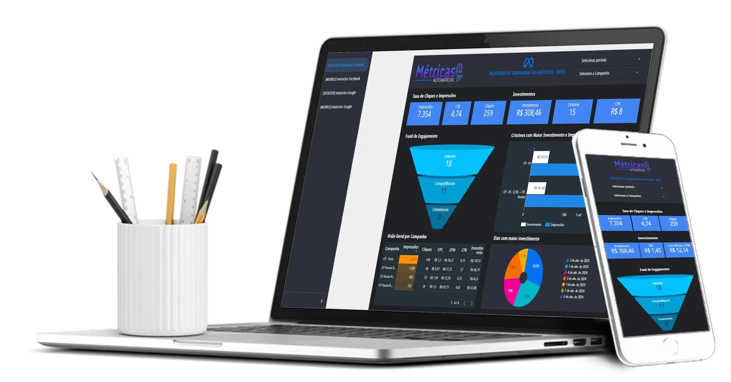 Crie Relatórios Personalizados para seus clientes acompanharem os resultados dos anúncios tanto no computador quanto pelo celular.