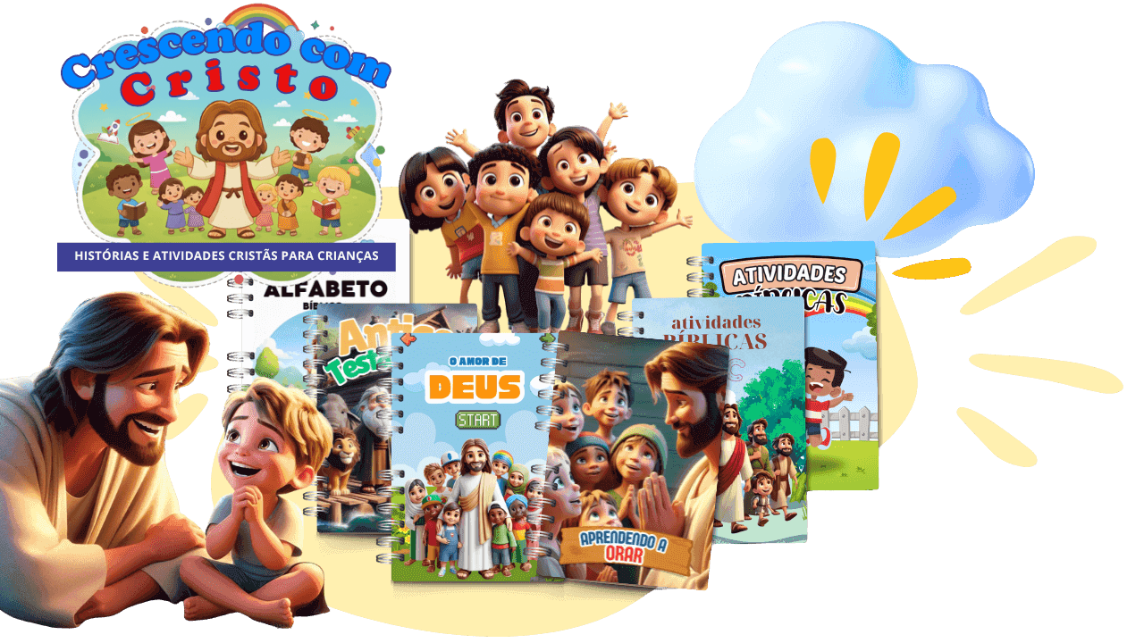 Conheça agora mesmo o Crescendo Com Cristo. Ele é um pacote em PDF com mais de 600 páginas com histórias e atividades bíblicas para imprimir, colorir e brincar.